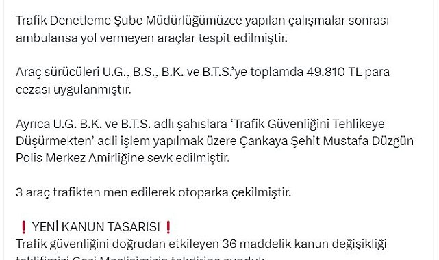İÇİŞLERİ Bakanı Ali Yerlikaya, "Yeni yasa tasarısında artık asker uğurlama, düğün vb. nedenle köprü, tünel, viyadük ve otoyol kapatarak trafiği engelleyen araç sürücülerine 180 bin TL para cezası yazılacak, 120 gün ehliyetleri geçici olarak geri alınacak ve 120 gün araçları trafikten menedilecek" dedi.Bakan Yerlikaya, sosyal medya hesabından yaptığı açıklamada, dün sosyal medyada, Ankara'da 'ambulansa yol vermeyen düğün konvoyu' ile ilgili bir paylaşım yapıldığını ifade etti. Trafik Denetleme Şube Müdürlüğü tarafından yapılan çalışmalar sonrası ambulansa yol vermeyen araçların tespit edildiğini belirten Yerlikaya, "Araç sürücüleri U.G., B.S., B.K. ve B.T.S.'ye toplamda 49 bin 810 TL para cezası uygulanmıştır. Ayrıca U.G., B.K. ve B.T.S. adlı şahıslara 'Trafik Güvenliğini Tehlikeye Düşürmekten' adli işlem yapılmak üzere Çankaya Şehit Mustafa Düzgün Polis Merkez Amirliğine sevk edilmiştir. 3 araç trafikten menedilerek otoparka çekilmiştir" dedi.YENİ KANUN TASARISIBakan Yerlikaya ayrıca konuyla ilgili yeni kanun tasarısını hatırlatarak, şunları kaydetti:"Trafik güvenliğini doğrudan etkileyen 36 maddelik kanun değişikliği teklifimizi Gazi Meclisimizin takdirine sunduk. Hazırladığımız yeni yasa tasarısı ile bu tür olayları engellemek amacıyla caydırıcı yeni yasal düzenlemeler yaptık. Yeni yasa tasarısında artık asker uğurlama, düğün vb. nedenle köprü, tünel, viyadük ve otoyol kapatarak trafiği engelleyen araç sürücülerine 180 bin TL para cezası yazılacak, 120 gün ehliyetleri geçici olarak geri alınacak ve 120 gün araçları trafikten menedilecek. Ambulansların can taşıdığını ve zamanla yarıştığı gerçeğini unutmamalıyız. Bugün yol vermediğimiz ambulans, yarın bizi ya da çok sevdiğimiz birini hastaneye yetiştirmeye çalışabilir."