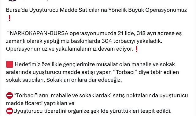 İÇİŞLERİ Bakanı Ali Yerlikaya, Bursa merkezli 21 ilde düzenlenen uyuşturucu operasyonunda 304 torbacının yakalandığını duyurdu.Bakan Yerlikaya, sosyal medya hesabından yaptığı açıklamada, "Narkokapan-Bursa' operasyonumuzda, 3 bin 190 polis, 452 ekip, 2 helikopter, 22 narkotik dedektör köpeği, 4 insansız hava aracının (İHA) katılımıyla Bursa merkezli 21 ilde 318 ayrı adrese yönelik operasyonlar gerçekleştirildi. Yaptığımız baskınlarda 304 torbacıyı yakaladık. Torbacıların mahalle ve sokaklardaki satış noktalarında uyuşturucu madde ticareti yaptıkları ve uyuşturucu ticaretini organize şekilde yürüttükleri tespit edildi. Operasyonumuzun hazırlıkları tam 4 ay sürdü. Bu 4 ay boyunca, adeta Bursa'nın bir kez daha röntgenini çektik. Saha çalışmalarımızı ve analizlerimizi büyük bir titizlikle gerçekleştirdik. Şüphelileri teknik ve fiziki takiple izledik. İşlenen suçlara dair tüm faaliyetleri tek tek delillendirdik ve düğmeye bastık" dedi.'HEDEFİMİZ SOKAK SATICILARI'Operasyona katılan ekipleri tebrik eden Yerlikaya, "Operasyonumuz ve yakalamalarımız devam ediyor. Hedefimiz özellikle gençlerimize musallat olan mahalle ve sokak aralarında uyuşturucu madde satışı yapan 'torbacı' diye tabir edilen sokak satıcıları. Sokakları onlara dar edeceğiz. Uyuşturucu, insanlığın en büyük düşmanıdır. Gençlerimizin hayatını çalmaya cüret eden, o zehir tacirleriyle ülkemiz ve insanlık adına mücadele etmeye devam edeceğiz" açıklamasında bulundu.