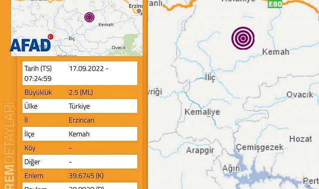 Erzincan'ın Kemah ilçesinde 2.5 büyüklüğünde hafif şiddetli bir deprem meydana geldi.Afet ve Acil Durum Yönetimi Deprem Dairesi Başkanlığından alınan bilgiye göre, saat 07.24'de merkez üssü Erzincan'ın Kemah ilçesinde 2.5 büyüklüğünde yerin 6.84 kilometre derinliğinde bir deprem meydana geldi. Depremde herhangi bir can ve mal kaybı yaşanmadı.