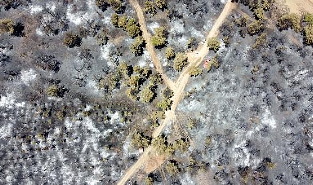 Yer yer soğutma çalışmaları sürerken, 58 hektar alanın zarar gördüğü bölge dron ile de görüntülendi.