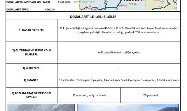 Hakkari-Van kara yolunda dün meydana gelen ve ulaşımda aksamalara neden olan heyelanın 200 metre uzunluğundaki alanı etkilediği bildirildi.Hakkari Valiliğinden yapılan açıklamada, 13 Nisan 2026 tarihinde Hakkari-Van kara yolunun Akçalı mevkiinde heyelan meydana geldiği belirtildi. 114. Şube Şefliği yol ağı içerisinde bulunan 400-36 K.K. numaralı güzergahta oluşan heyelanın yaklaşık 200 metre uzunluğundaki bir alanda etkili olduğu bildirilen açıklamada, heyelanın ardından ilgili kurum ve ekiplerin hızla bölgeye sevk edildiği, yol güvenliği ve ulaşımın devamlılığının sağlanması amacıyla gerekli tedbirlerin alındığı ifade edildi.Bölgede yürütülen çalışmalar kapsamında 1 ekskavatör, 2 yükleyici, 1 greyder, 1 kanal kazıcı, 5 kamyon, 1 ekip aracı ve 1 trafik ekibi aracı olmak üzere toplam 20 personelin görev yaptığı kaydedilen açıklamada, mevcut durumda yolun kontrollü olarak trafiğe açık tutulduğu, sürücülerin trafik işaret ve işaretçilerine dikkat etmeleri ve ekiplerin yönlendirmelerine uymalarının önem taşıdığı vurgulandı.Valilik koordinasyonunda Karayolları, AFAD ve emniyet ekiplerinin bölgedeki çalışmalarının sürdüğü, ulaşımın en kısa sürede tamamen güvenli hale getirilmesinin hedeflendiği bildirildi.