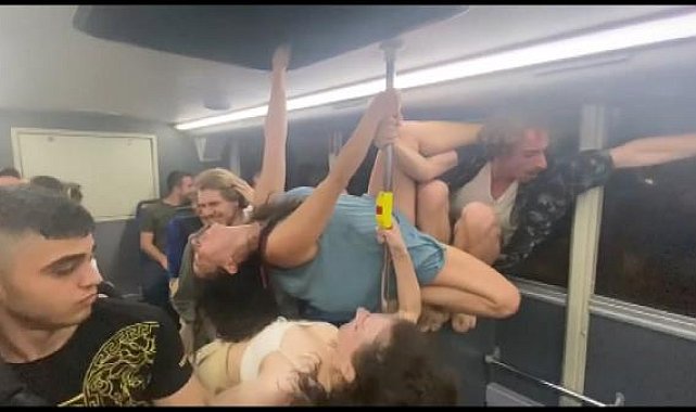 Gruptakiler otobüste direk dansı da yaptı. Otobüse binen bazı yolcular da eğlenceye katıldı. Koltukların üzerine çıkan, direkleri kullanarak da dans eden gruptakiler kameralara yansıdı. Otobüsten inen gençler, cadde üzerinde dansa devam etti.
