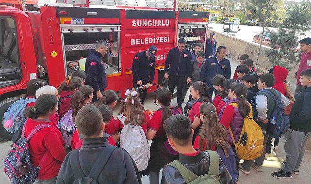 Sungurlu Belediyesi İtfaiye Müdürlüğü ekipleri, kendilerini ziyaret eden Atatürk Ortaokulu öğrencilerini yangın konusunda bilgilendirdi.Atatürk Ortaokulu öğrencileri, Sungurlu Belediyesi İtfaiye Müdürlüğü'nü ziyaret etti. Ziyarette İtfaiye Müdürlüğü personeli tarafından öğrencilere, yangın farkındalık eğitimi ile bilinçlendirildi. Ekipler, ihtimal yangın durumlarında nasıl hareket edilmesi gerektiği, temel yangın güvenliği kuralları ve acil durumlarda yapılması gerekenleri öğrencilere uygulamalı olarak gösterdi. Öğrencilere kullanılması gereken ekipmanlar da tanıtıldı.Sungurlu Belediyesi İtfaiye Müdürlüğü yetkilileri, bu tür eğitim ve ziyaretlerin çocuklarda farkındalık oluşturmak adına büyük önem taşıdığını belirterek, eğitim faaliyetlerinin devam edeceğini ifade etti.