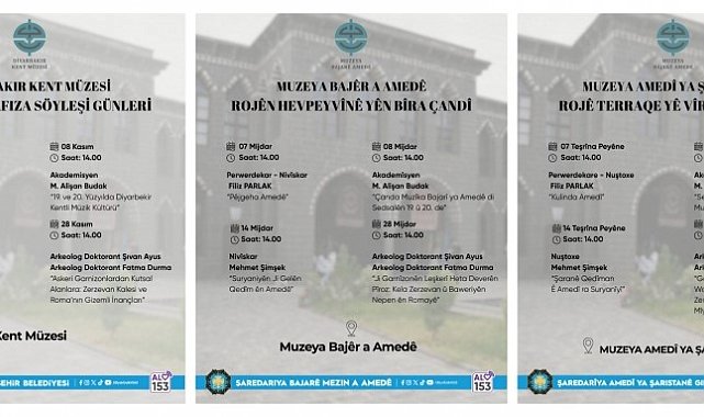 Diyarbakır Büyükşehir Belediyesi Cemilpaşa Konağı Kent Müzesinde Kasım ayı boyunca çeşitli başlıklarda, akademisyen, eğitimci, yazar ve arkeologların katılacağı kültürel hafıza söyleşileri düzenleyecek.Büyükşehir Belediyesi Kültür ve Sosyal İşler Dairesi Başkanlığı bünyesinde faaliyet yürüten Kent Müzesi geçici sergi salonu kültürel hafıza söyleşilerine ev sahipliği yapacak. 7 Kasım 14.00'te eğitimci yazar Filiz Parlak'ın "Diyarbakır Mutfağı" başlıklı söyleşisi gerçekleştirilecek. Akademisyen M. Alişan Budak'ın "19. ve 20. Yüzyılda Diyarbekir Kentli Müzik Kültürü" konulu söyleşisi ise 8 Kasım, saat 14.00'te olacak.14 Kasım günü yine aynı saatte Yazar Mehmet Şimşek "Diyarbakır Kadim Halklarından Süryaniler" başlığıyla söyleşi gerçekleştirecek. Arkeolog Doktorant Şıvan Ayus ile Arkeolog Doktorant Fatma Durma "Askeri Garnizonlardan Kutsal Alanlara: Zerzevan Kalesi ve Roma'nın Gizemli İnançları" konulu söyleşiyle 28 Kasım, saat 14.00'te Kent Müzesinde olacak.
