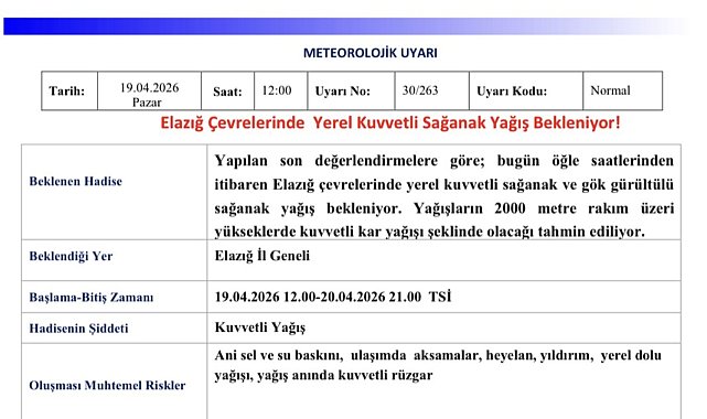 IHAAW130104-CVR/19-04-2026 - Meteorolojiden Elazığ için yağış uyarısı (Fotoğraflı) ELAZIĞ (İHA) - Meteoroloji, Elazığ için sağanak yağış uyarısı yaptı. Meteoroloji 13. Bölge Müdürlüğü tarafından yapılan uyarıda, "Yapılan son değerlendirmelere göre; bugün öğle saatlerinden itibaren Elazığ çevrelerinde yerel kuvvetli sağanak ve gök gürültülü sağanak yağış bekleniyor. Yağışların 2000 metre rakım üzeri yükseklerde kuvvetli kar yağışı şeklinde olacağı tahmin ediliyor. Oluşması muhtemel risklere karşı tedbirli ve dikkatli olunması gerekmektedir" denildi. (CK-Y)19.04.2026 13:03:51 TSINNNN