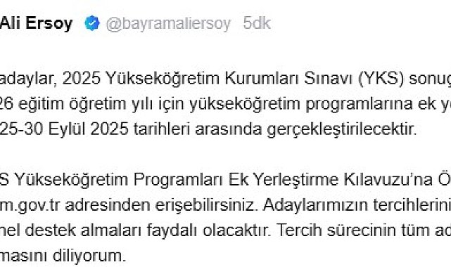 ÖLÇME Seçme ve Yerleştirme Merkezi (ÖSYM) Başkanı Bayram Ali Ersoy, "2025-2026 eğitim öğretim yılı için yükseköğretim programlarına ek yerleştirme işlemleri 25-30 Eylül 2025 tarihleri arasında gerçekleştirilecektir" dedi.ÖSYM Başkanı Ersoy, NSosyal hesabından yaptığı açıklamada, "Kıymetli adaylar, 2025 Yükseköğretim Kurumları Sınavı (YKS) sonuçlarına göre, 2025-2026 eğitim öğretim yılı için yükseköğretim programlarına ek yerleştirme işlemleri 25-30 Eylül 2025 tarihleri arasında gerçekleştirilecektir. 2025-YKS Yükseköğretim Programları Ek Yerleştirme Kılavuzu'na ÖSYM'nin www.osym.gov.tr adresinden erişebilirsiniz. Adaylarımızın tercihlerini belirlerken profesyonel destek almaları faydalı olacaktır. Tercih sürecinin tüm adaylarımız için hayırlı olmasını diliyorum" ifadelerini kullandı.
