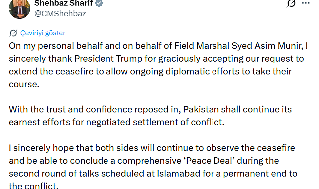 Pakistan Başbakanı Şahbaz Şerif, diplomatik çabaların devamına imkan tanımak için İran'la varılan 2 haftalık ateşkesi uzatma taleplerini kabul eden ABD Başkanı Donald Trump'a teşekkür etti.Pakistan Başbakanı Şahbaz Şerif'ten, İran ile daha önce varılan 2 haftalık ateşkesi uzatma kararı alan ABD Başkanı Donald Trump'a teşekkür açıklaması geldi. Sosyal medya hesabından bir paylaşım yapan Şerif, "Kendim ve ve Pakistan Genelkurmay Başkanı Asim Munir adına, diplomatik çabaların devamına imkan tanımak için İran'la varılan ateşkesi uzatma talebimizi nezaketle kabul eden Başkan Trump'a içtenlikle teşekkür ederim" ifadelerini kullandı. Pakistan'ın kendisine duyulan güven ve inanç doğrultusunda çatışmanın müzakere yoluyla çözümüne yönelik çabalarını sürdüreceğini vurgulayan Şerif, "Her iki tarafın da ateşkesi sürdürmesini ve çatışmaya kalıcı bir son vermek amacıyla İslamabad'da yapılması planlanan ikinci tur görüşmelerde kapsamlı bir 'Barış Anlaşması' imzalayabilmesini içtenlikle umuyorum" dedi.Trump, ateşkesi uzatma kararı almıştıABD Başkanı Donald Trump, Pakistan Başbakanı Şahbaz Şerif ile Pakistan Genelkurmay Başkanı Asim Munir'in İranlı liderler ve temsilciler ortak bir teklif oluşturana kadar İran'a yönelik saldırıları durdurmalarını istediklerini belirterek, "Bu nedenle ordumuzun ablukayı sürdürmesine, her bakımdan tetikte kalmasına ve bir teklif sunulup görüşmeler olumlu veya olumsuz bir sonuca varana kadar ateşkesin uzatılmasına yönelik talimat verdim" açıklamasında bulunmuştu. İran basını ise, Tahran yönetiminin yarın İslamabad'da yapılacak görüşmelere katılmayacağını Pakistan aracılığıyla ABD tarafına ilettiğini bildirmişti. ABD basını da, ABD Başkan Yardımcısı James David Vance'in Pakistan ziyaretinin askıya alındığını ancak iptal edilmediğini duyurmuştu.