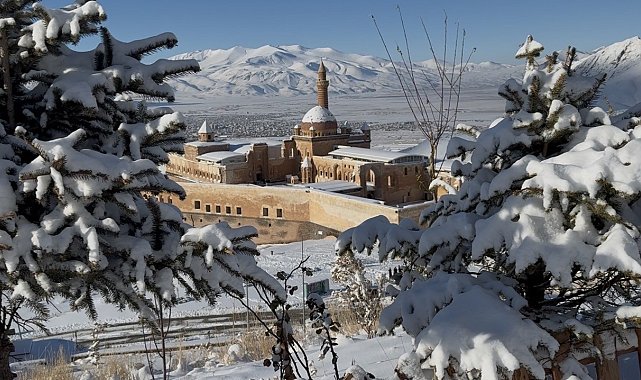 Ağrı'nın Doğubayazıt ilçesinde etkili olan yoğun kar yağışı, tarihi İshak Paşa Sarayı'nda eşsiz görüntüler ortaya çıkardı. UNESCO Dünya Mirası Geçici Listesi'nde yer alan ve her yıl binlerce yerli-yabancı turisti ağırlayan saray, karla birlikte adeta beyaza büründü.Kar yağışının ardından sarayın avlusu, taş duvarları ve çevresindeki tarihi dokular tamamen karla kaplanırken, oluşan manzara görenleri hayran bıraktı. Doğubayazıt'ın simgelerinden biri olan İshak Paşa Sarayı, karın etkisiyle kartpostallık görüntüler sunarak ziyaretçilerin ve fotoğraf tutkunlarının ilgisini çekti.